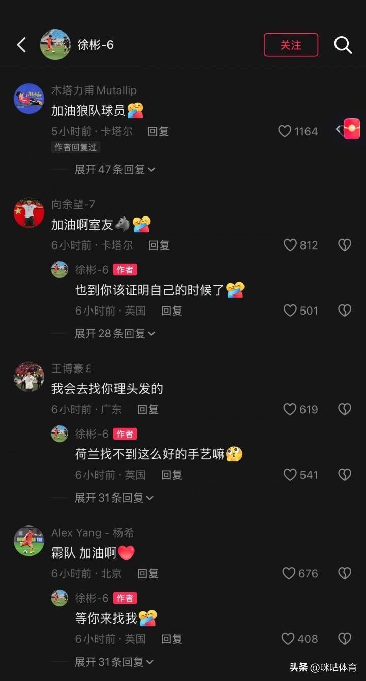 U23国足的队友们在褒贬区纷纷留言,包括木塔力甫、向余望、王博豪、杨希、李镇全、彭啸等东说念主,其中木塔力甫褒贬“加油狼队球员”,徐彬逐个复兴,IP露出已在英国。